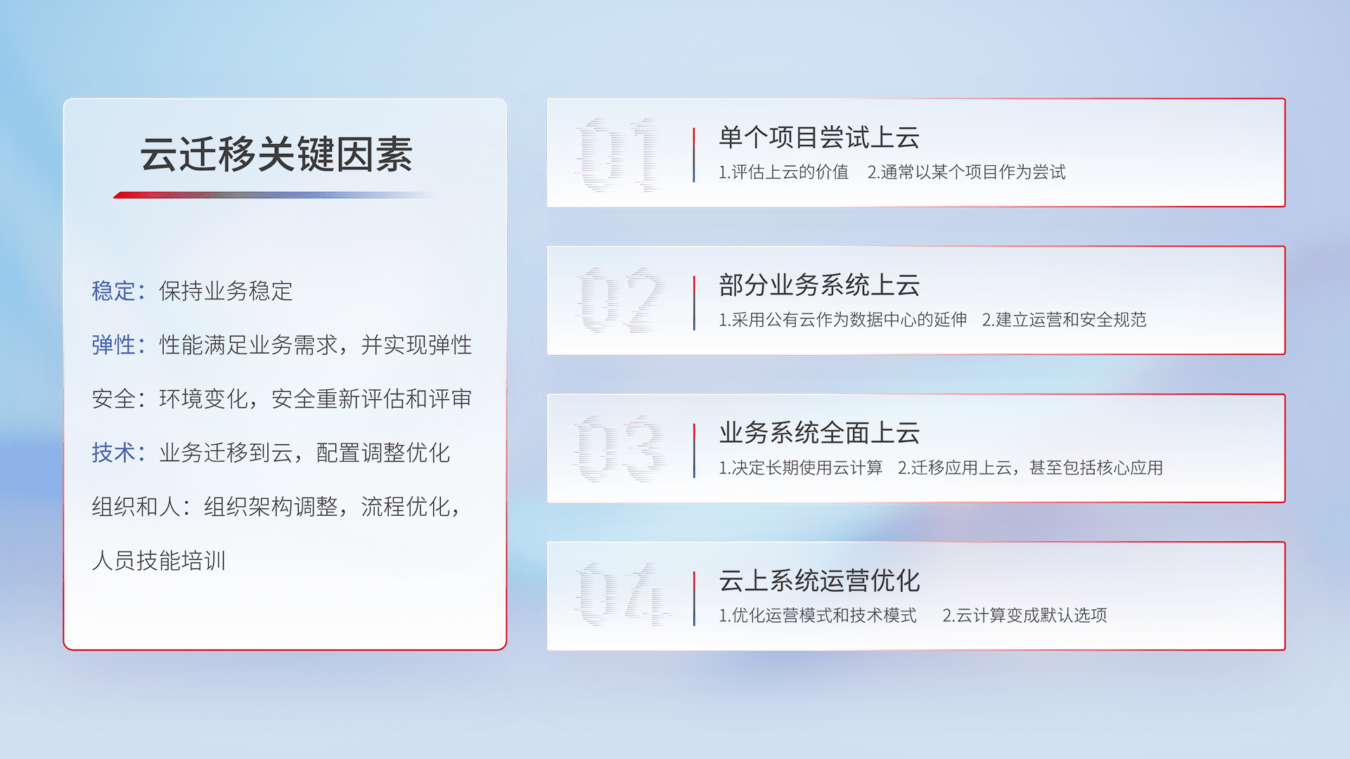 结合实际业务,,,,从规划设计、、、、云平台选型、、云原生改造、、、数据迁移、、、集成交付,,迁移全过程为客户识别最佳上云路径,,做好风险识别管理,,,设计网络架构、、、、身份权限、、、安全审计合规、、、、操作审计、、日志审计、、、监控告警策略、、、、多站点容灾设计等,,对云上基础设施进行整体规划,,,,提升IT治理水平,,以满足弹性、、、、高可用、、高性能的需求。。。。