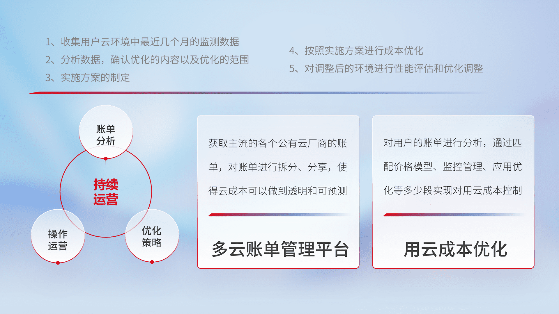 通过多云纳管,,以统一的资源数据模型把客户的云资源进行抽象和封装,,,,进而实现对多云资源的统一操作,,,保障云资源管理的可靠性、、、稳定性与可用性。。量身定制化运维内容,,,配置、、开发运维、、补丁管理、、备份、、、、监控、、、认证和访问管理、、、、审计和日常巡检等,,保障在用云过程中的可靠度,,,,稳定度以及高可用率。。。。